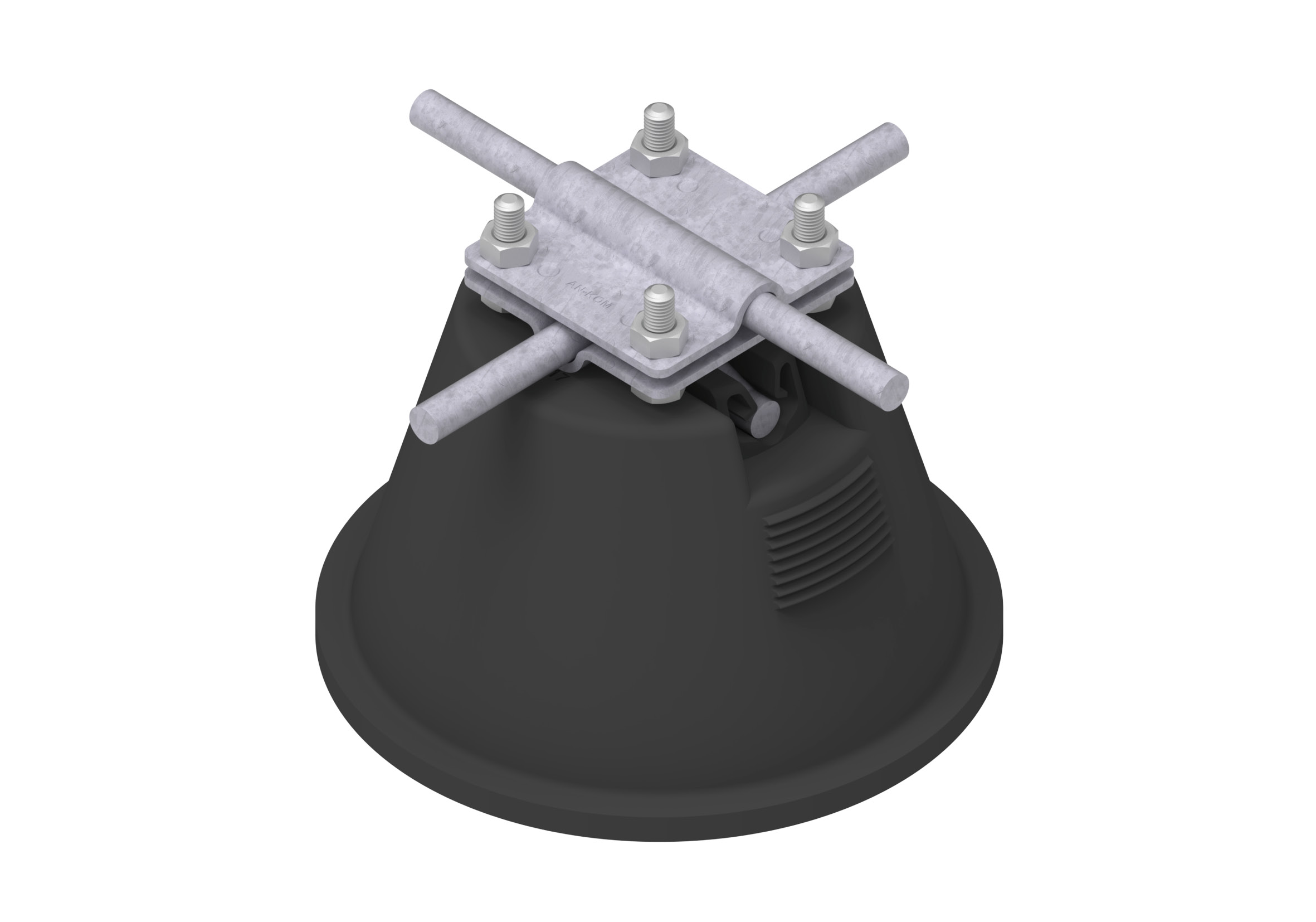 Concrete holder in plastic with a rotating base is used to build an air terminal grid on flat roofs. After attaching the stand and inserting the holder into it, it is possible to rotate the handle in any direction. Made of polypropylene - PP (frost resistant) with additives protecting against UV radiation. The holder is filled with a frost-resistant cement mortar.