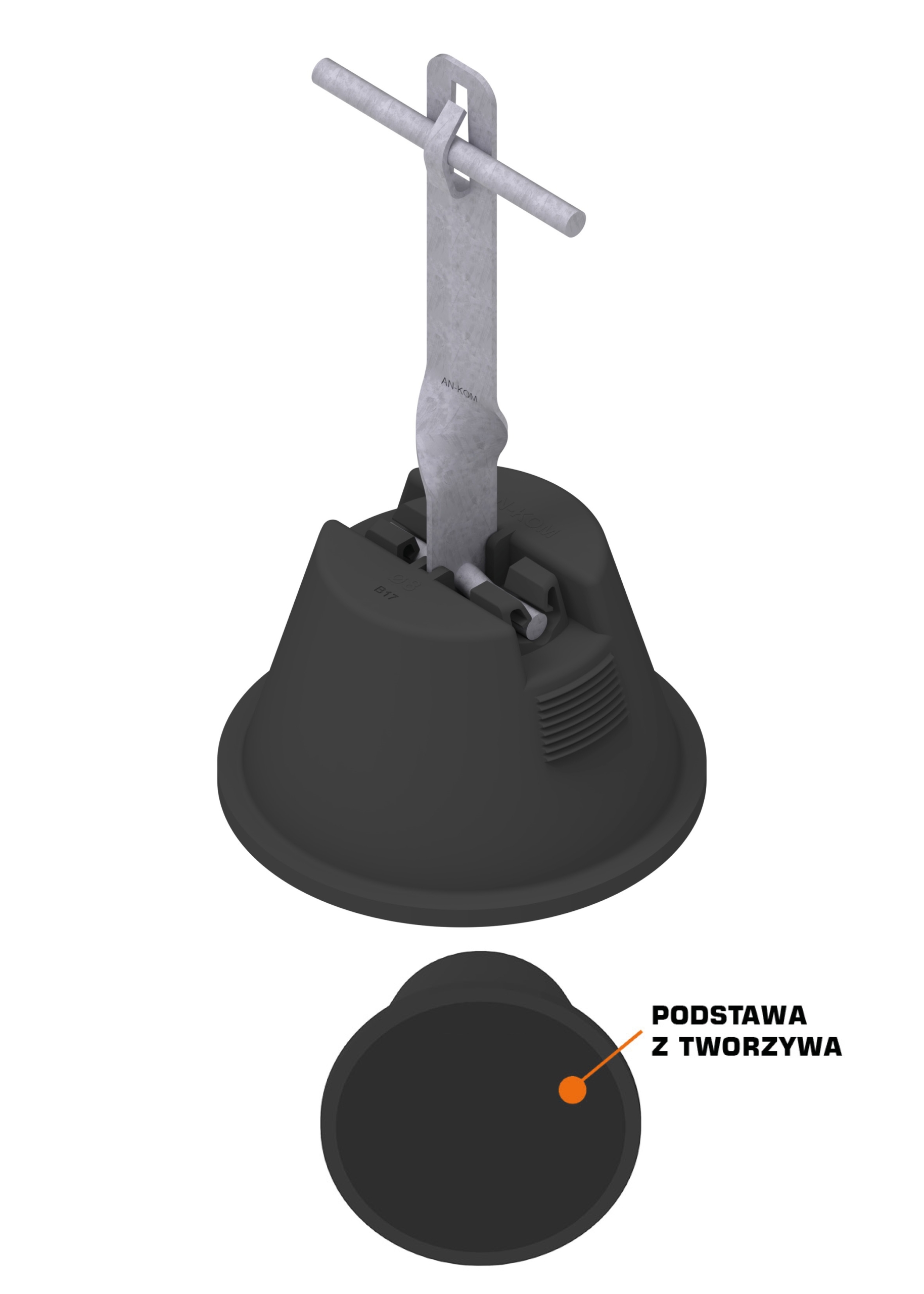 Concrete holder in plastic with a plastic bottom is used to build an air terminal grid on flat roofs. Made of polypropylene - PP (frost resistant) with additives protecting against UV radiation. The bottom of the holder is made of ABS plastic which enables gluing the holder to the roofing. The support is filled with a frost-resistant cement mortar.