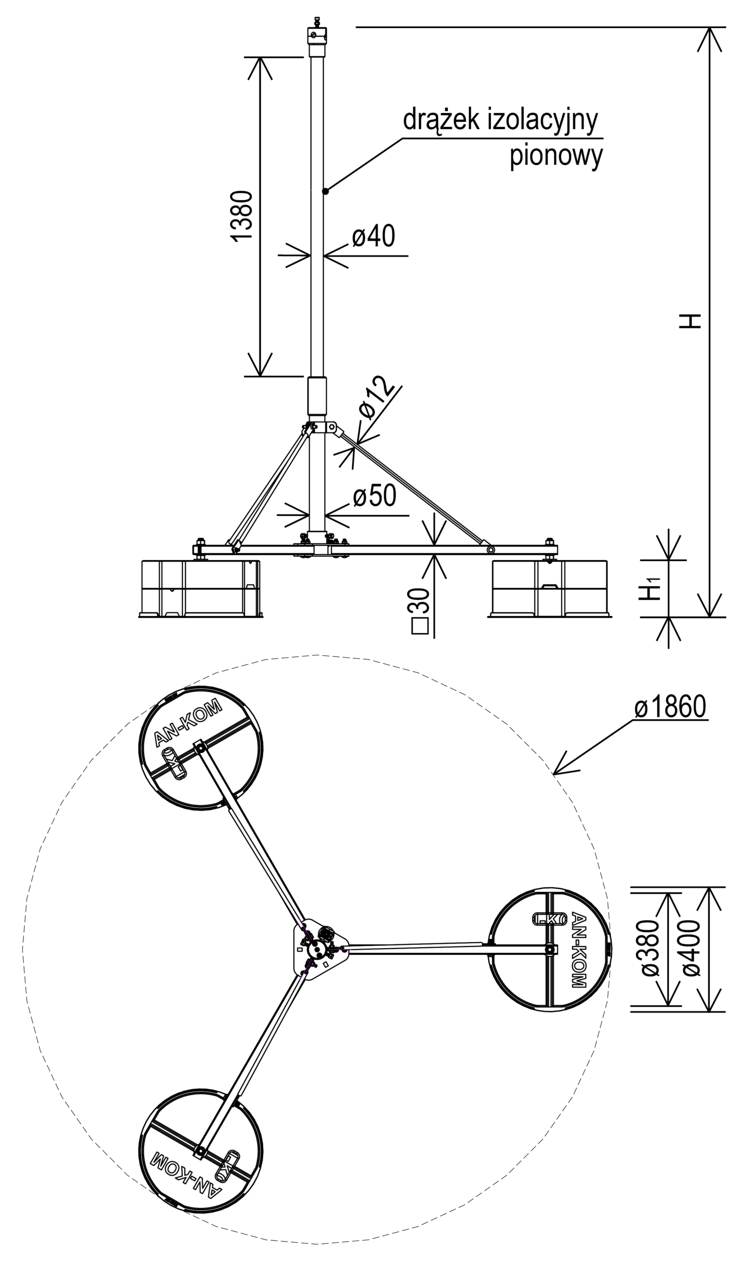 Maszt klatkowy izolowany na trójnogu.
