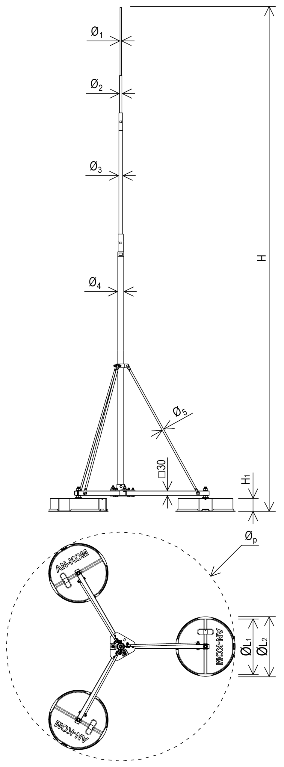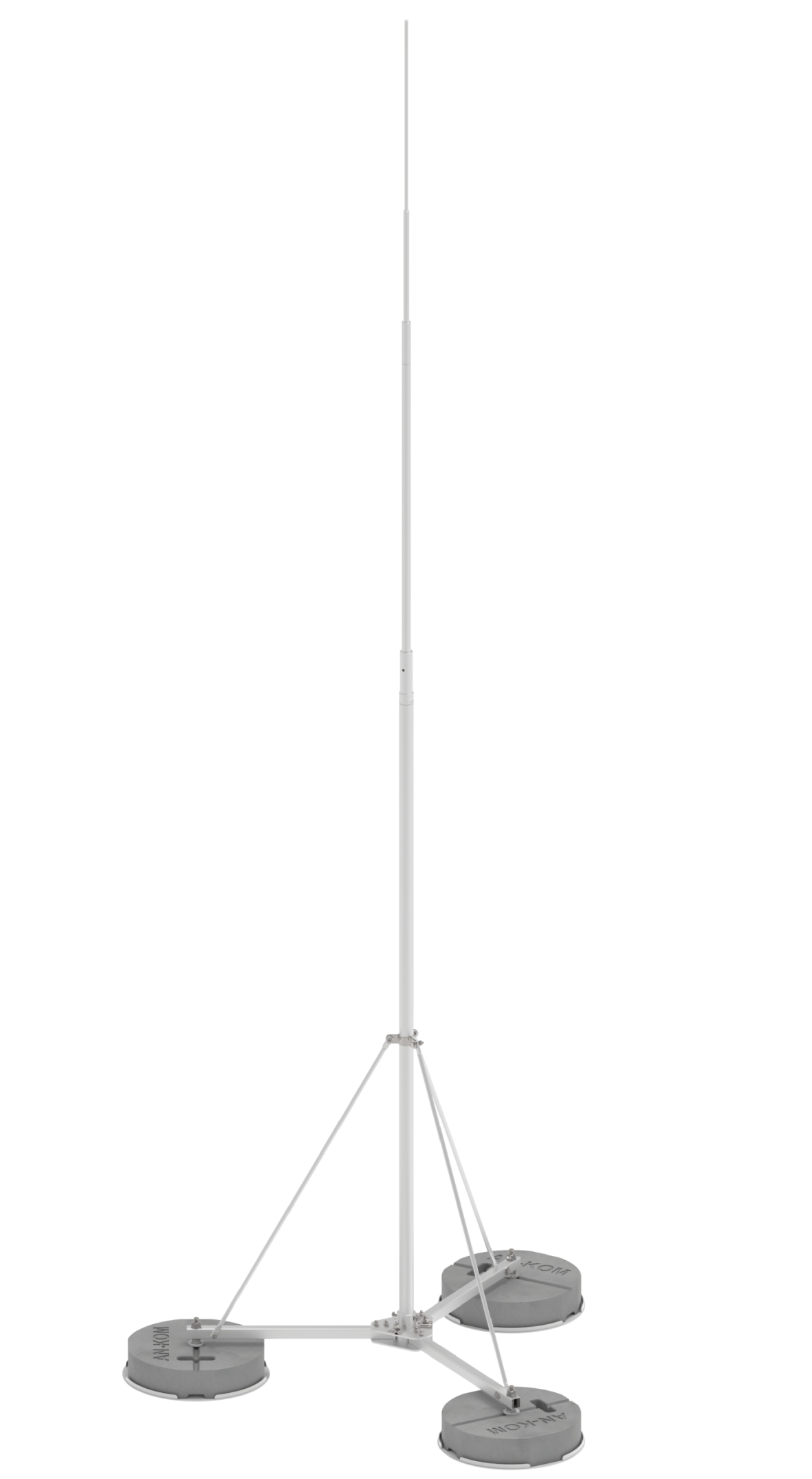 Maszty odgromowe wolnostojące na potrójnym obciążniku (trójnóg) tworzą przestrzeń chronioną. Nie wymagają klejenia. Oferowane w komplecie z osprzętem: podkładki pcv pod obciążniki betonowe, obciążniki, podpory, iglica, złącze do przyłączenia masztu do siatki zwodów.