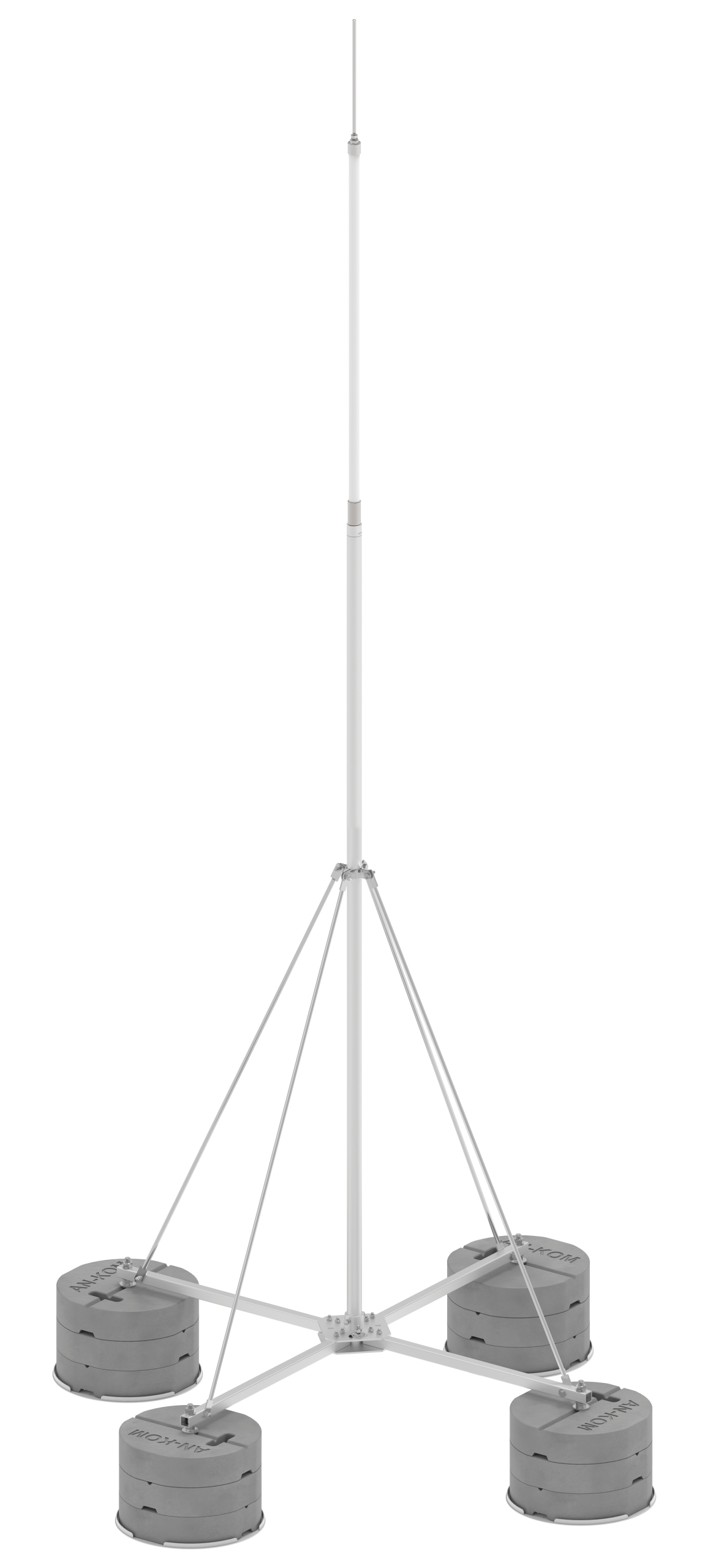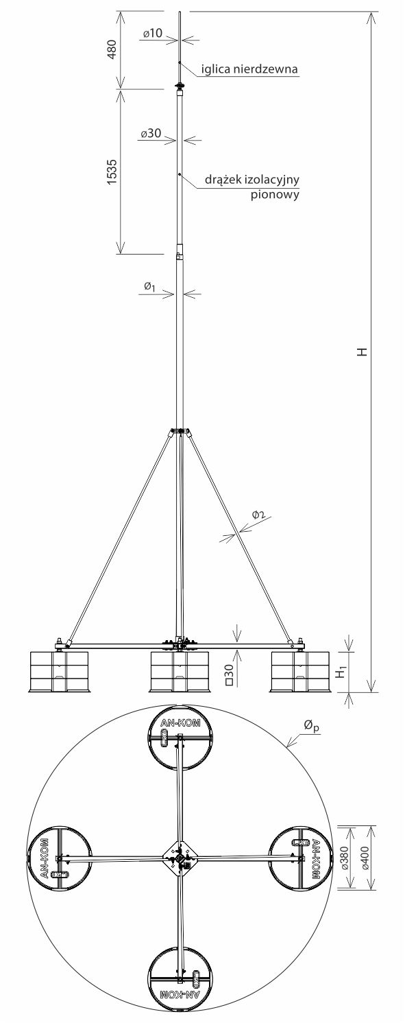 Maszty aluminiowe na czwórnogu do PW* przeznaczone do ochrony urządzeń na dachach obiektów przemysłowych w miejscach, gdzie nie jest możliwe zachowanie odstępu iskrobezpiecznego. Prąd pioruna z iglicy masztu odprowadzany jest przewodem w izolacji wysokonapięciowej PW. Nie wymagają klejenia. Oferowane w komplecie z osprzętem: podkładki pcv pod obciążniki betonowe, podpory, izolator pionowy, iglica.