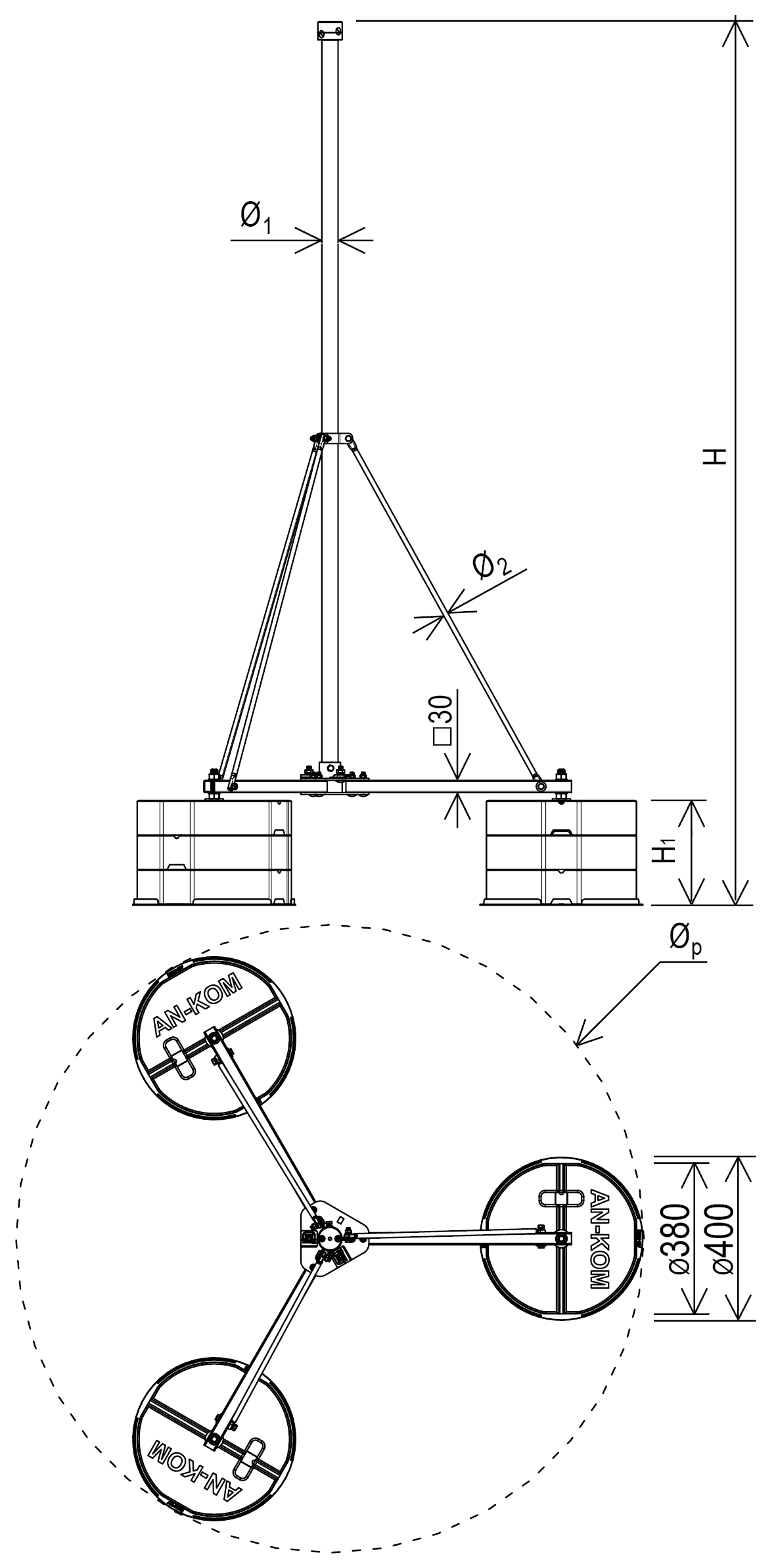 Maszt klatkowy aluminiowy wolnostojący na trójnogu. Służy do budowy zwodów poziomych podwyższonych (klatek ochronnych).