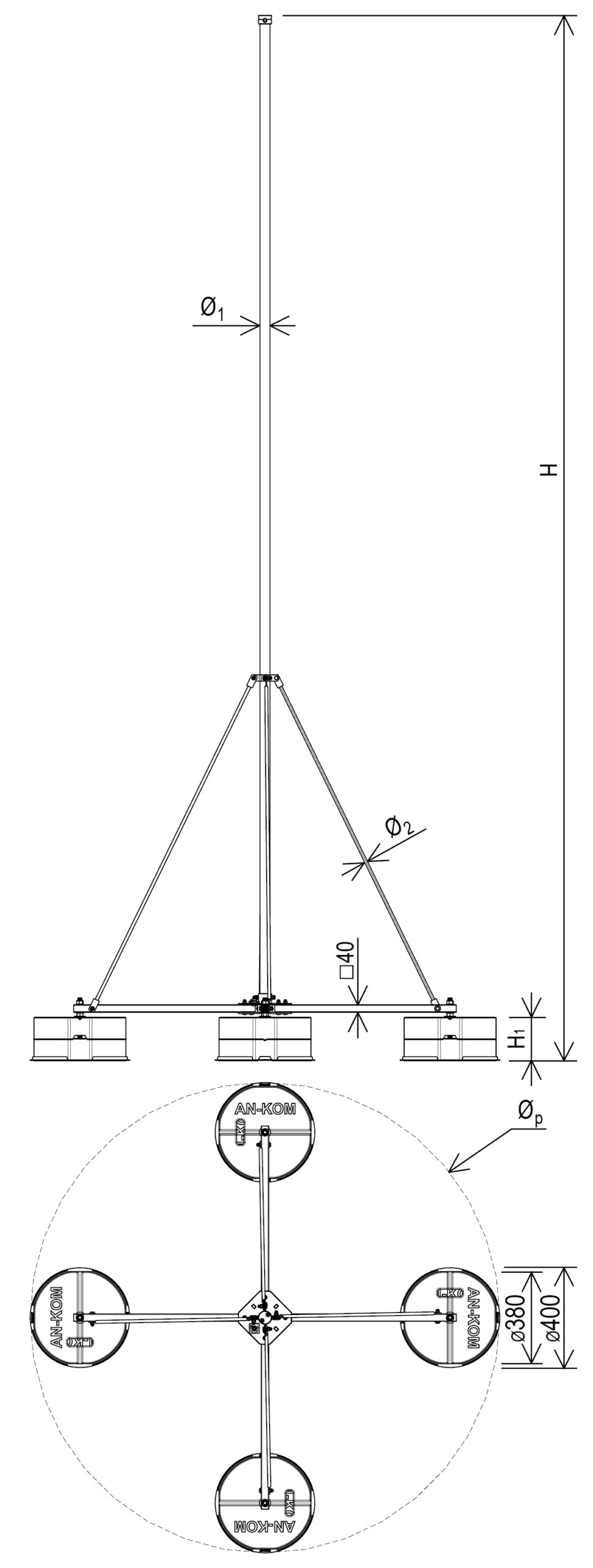 Maszt klatkowy aluminiowy wolnostojący na czwórnogu. Służy do budowy zwodów poziomych podwyższonych (klatek ochronnych).