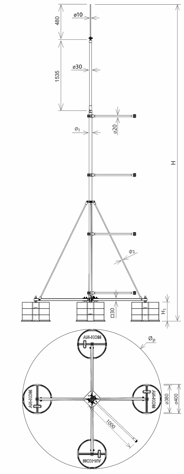 Maszty wolnostojące aluminiowe ze zwodem odsuniętym na czwórnogu wraz z obciążnikami. Służą do odprowadzenia prądu pioruna przy zachowaniu odstępu iskrobezpiecznego, który zapewniają drążki izolacyjne poziome.