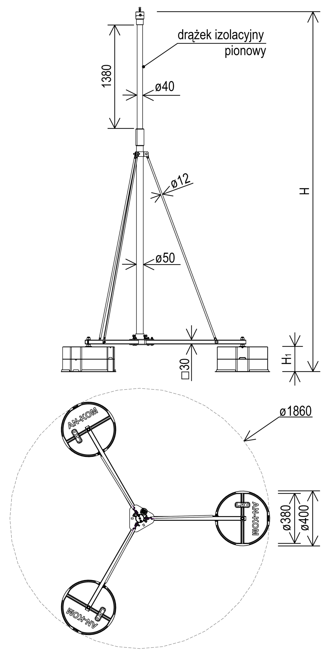 Maszt klatkowy izolowany na trójnogu.